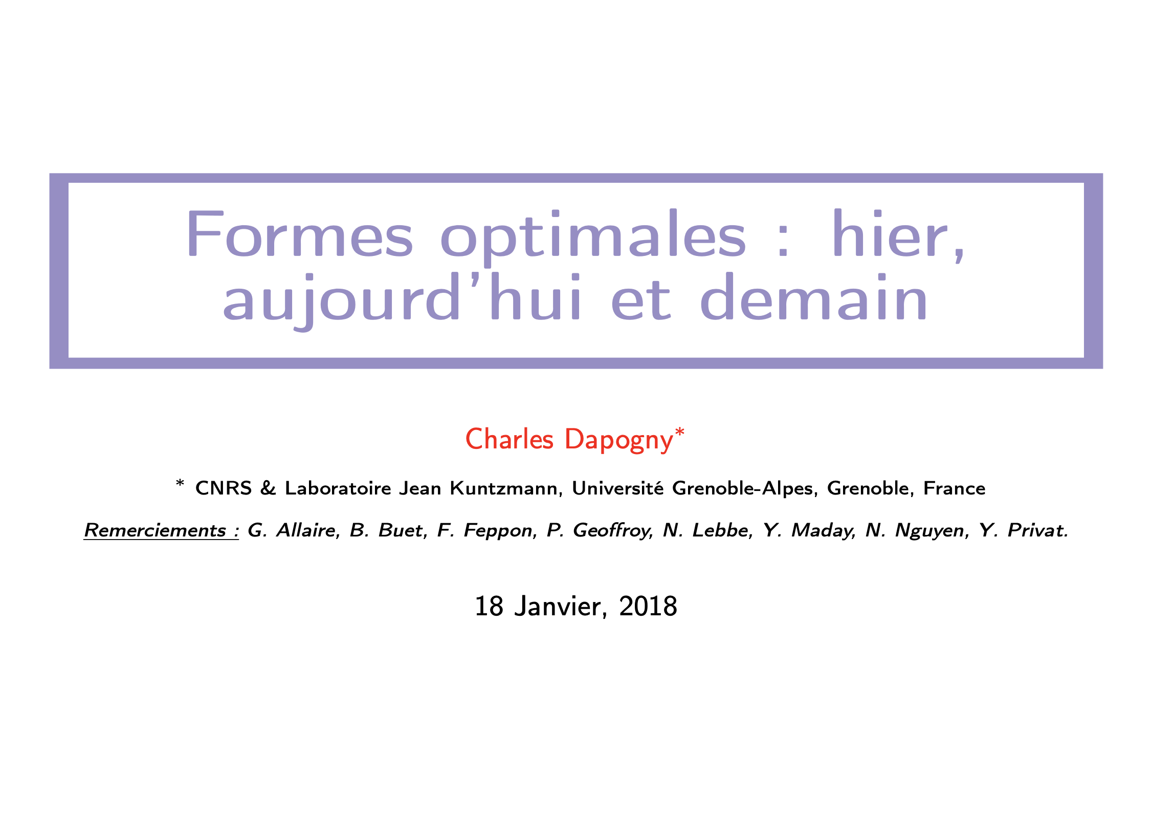 A popularization article aimed at mathematicians about shape and topology optimization (in French). | The slides (in French) of a large-audience presentation, given in the French prep school of Saint-Brieuc. |